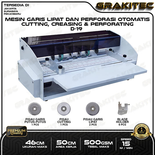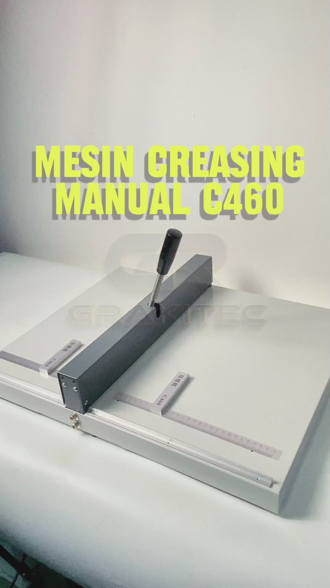 Mesin Creasing Manual Atau Mesin Pelipat Kertas Manual berfungsi untuk melipat kertas atau membuat Jalur Rel dikertas (untuk memudahkan lipatan) Seperti Brosur, Undangan, Photo, Karton, dll. Cara kerjanya dengan memasukan satu per satu lembar kertas dan menekan tuas, seketika garis / lipatan terlihat rapi.